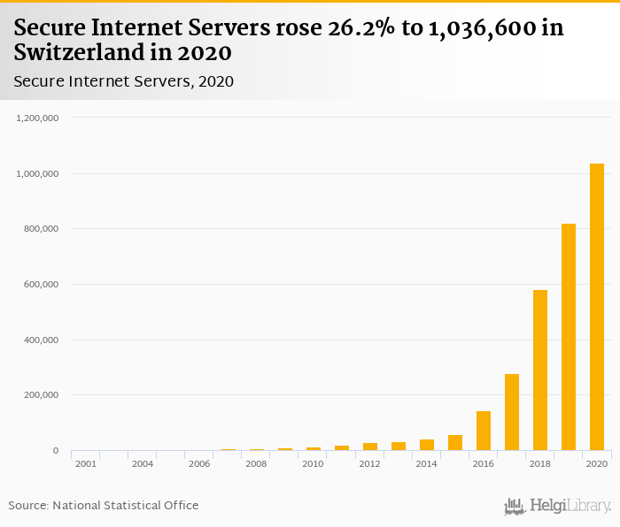 Secure internet servers rose 26.2% to 1,036,600 in Switzerland in 2020, according to World Bank.