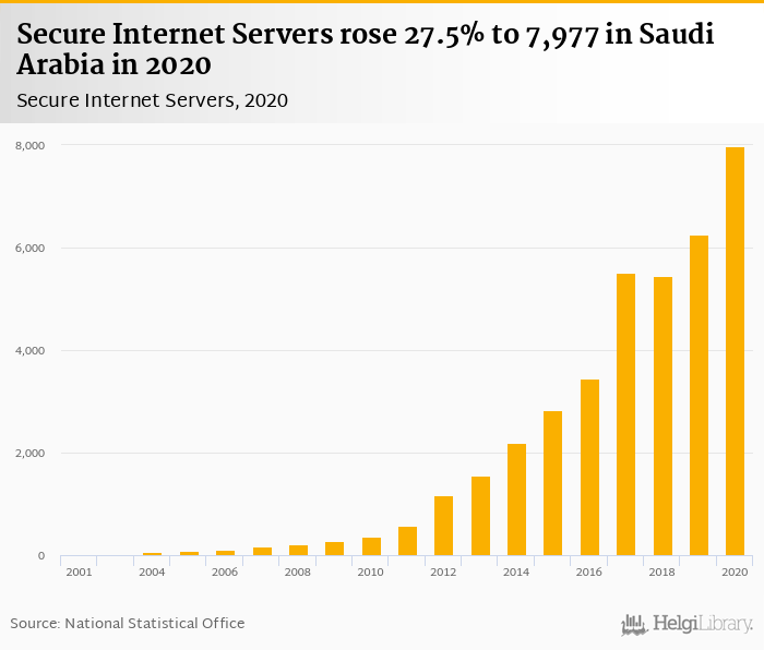 Secure internet servers rose 27.5% to 7,977 in Saudi Arabia in 2020, according to World Bank.