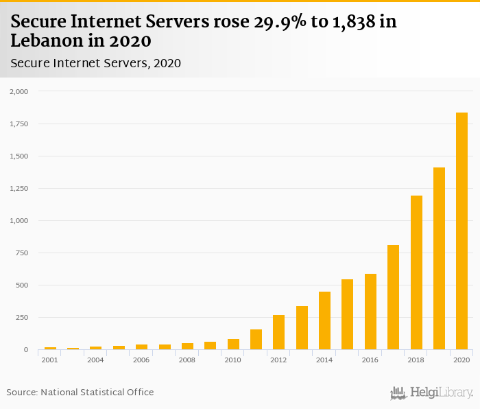 Secure internet servers rose 29.9% to 1,838 in Lebanon in 2020, according to World Bank.