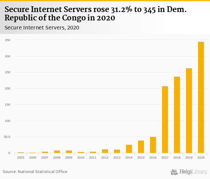 Secure internet servers rose 31.2% to 345 in Dem. Republic of the Congo in 2020, according to World Bank.