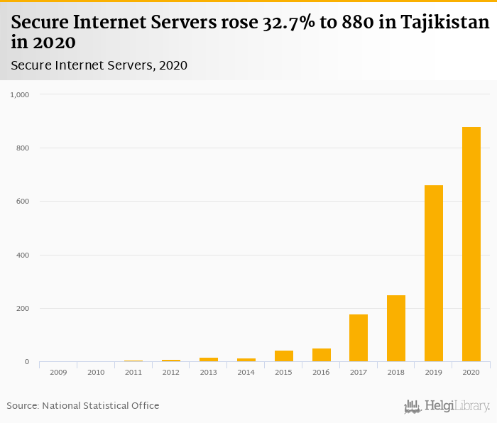 Secure internet servers rose 32.7% to 880 in Tajikistan in 2020, according to World Bank.