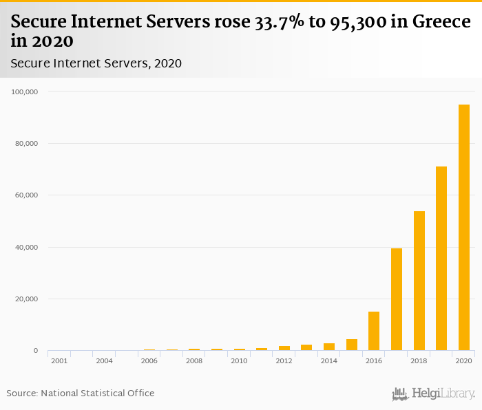 Secure internet servers rose 33.7% to 95,300 in Greece in 2020, according to World Bank.