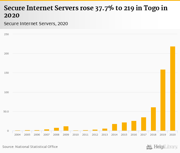 Secure internet servers rose 37.7% to 219 in Togo in 2020, according to World Bank.