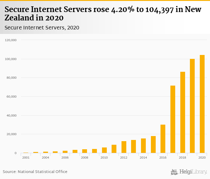 Secure internet servers rose 4.20% to 104,397 in New Zealand in 2020, according to World Bank.