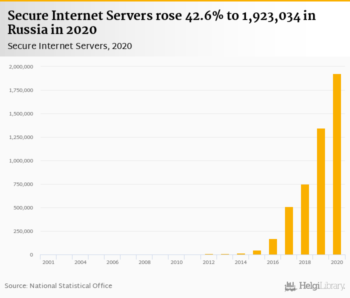 Secure internet servers rose 42.6% to 1,923,034 in Russia in 2020, according to World Bank.