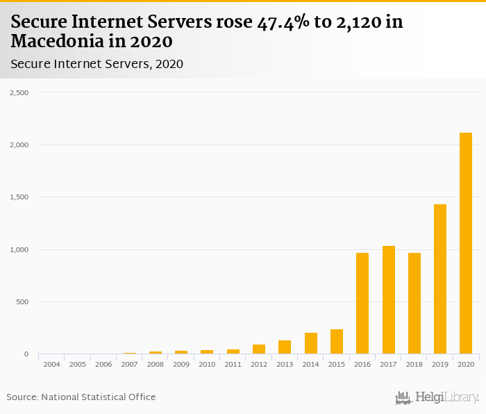 Secure internet servers rose 47.4% to 2,120 in Macedonia in 2020, according to World Bank.