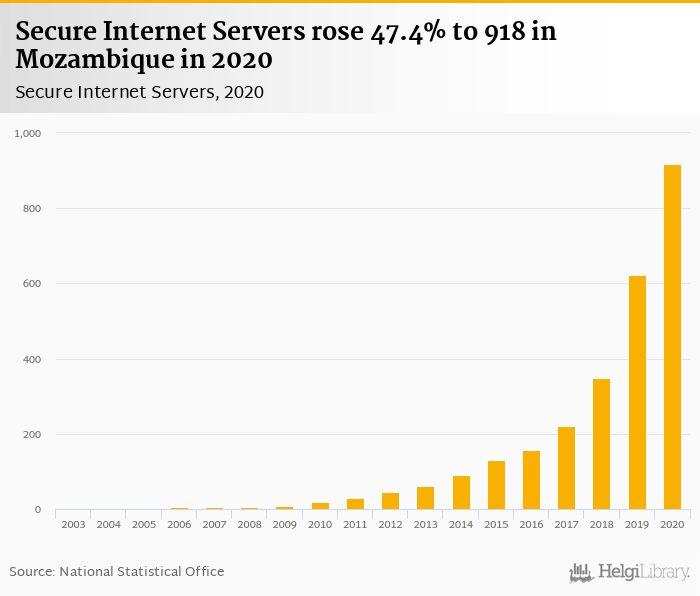Secure internet servers rose 47.4% to 918 in Mozambique in 2020, according to World Bank.