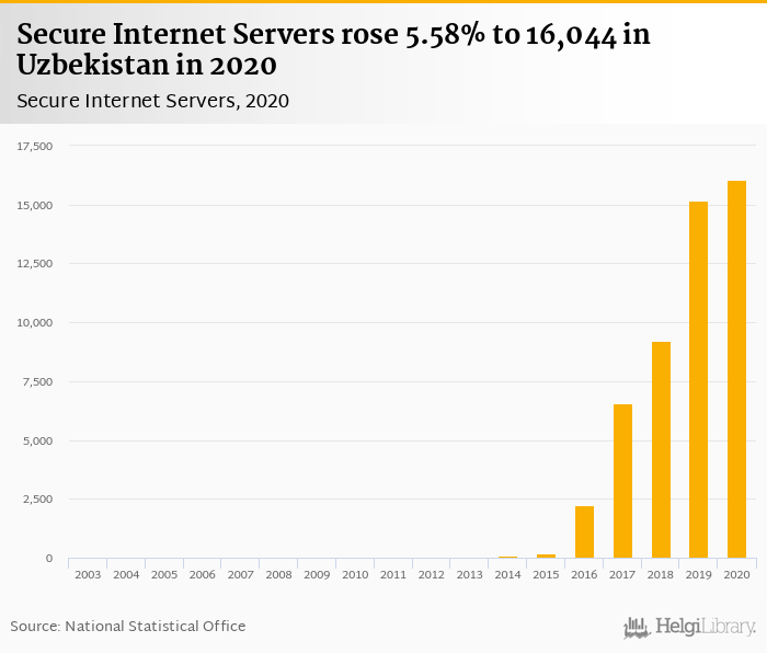 Secure internet servers rose 5.58% to 16,044 in Uzbekistan in 2020, according to World Bank.