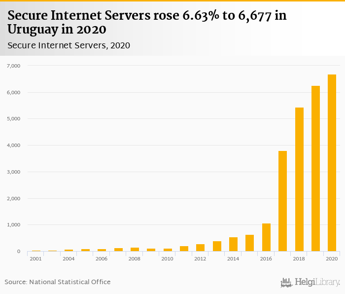 Secure internet servers rose 6.63% to 6,677 in Uruguay in 2020, according to World Bank.