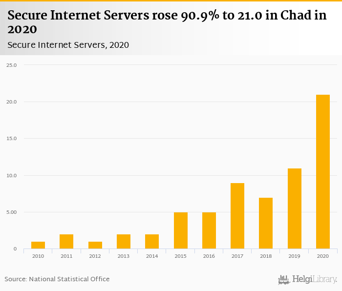 Secure internet servers rose 90.9% to 21.0 in Chad in 2020, according to World Bank.