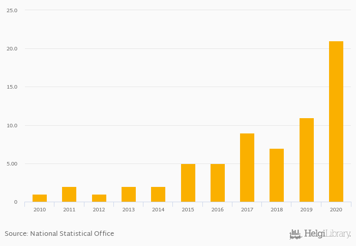 Historically, secure internet servers in Chad reached an all time high of 21.0 in 2020 and an all time low of 1.00 in 2010. When compared to Chad's main peers, secure internet servers in Cameroon amounted to 444, 35.0 in Niger, 15,242 in Nigeria and 282 in Sudan in 2020.