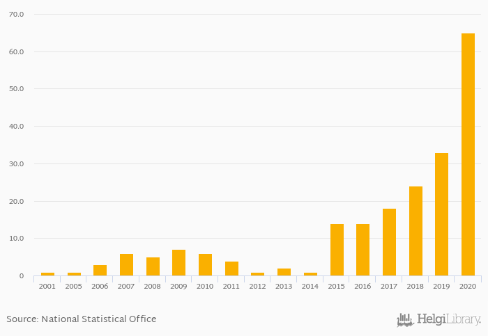 Historically, secure internet servers in Mauritania reached an all time high of 65.0 in 2020 and an all time low of 1.00 in 2001. When compared to Mauritania's main peers, secure internet servers in Algeria amounted to 2,106, 217 in Mali, 16,219 in Morocco and 441 in Senegal in 2020.