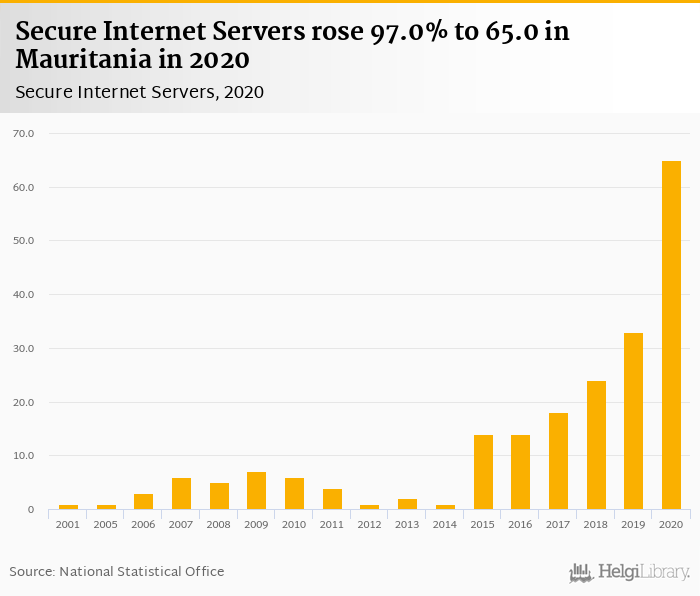 Secure internet servers rose 97.0% to 65.0 in Mauritania in 2020, according to World Bank.