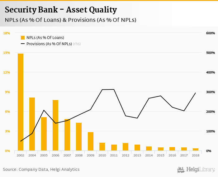 Security Bank's non-performing loans reached 0.403% of total loans at the end of 2018, down from 0.510% compared to the previous year. Historically, the NPL ratio hit an all time high of 14.9% in 2002 and an all time low of 0.403% in 2018.