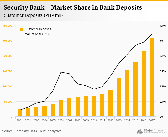 Security Bank accounted for 4.17% of all customer deposits taken by banks in Philippines at the end of 2017. Historically, the bank’s market share in customer deposits reached an all time high of 4.17% in 2017 and an all time low of 2.17% in 2001.