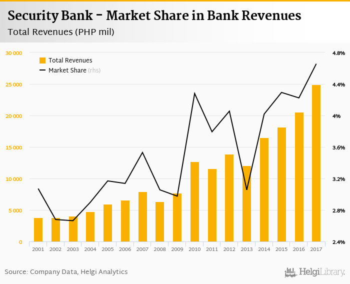 As a result, Security Bank accounted for 4.66% of all bank revenues generated by banks in Philippines in 2017. Historically, the bank’s market share in total revenues reached an all time high of 4.66% in 2017 and an all time low of 2.66% in 2003.