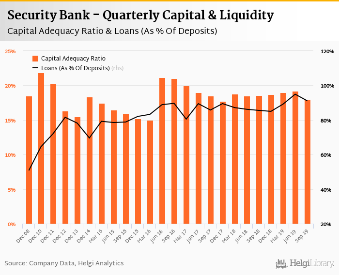 Security Bank's capital adequacy ratio reached 18.0% at the end of third quarter of 2019, down from 19.2% when compared to the previous quarter. Historically, the bank’s capital ratio hit an all time high of 21.8% in 4Q2010 and an all time low of 15.0% in 1Q2016.