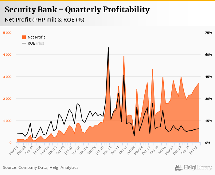 Security Bank made a net profit of PHP 2,708 mil in the third quarter of 2019, up 26.5% when compared to the same period of last year. This implies a return on equity of 9.33%.
