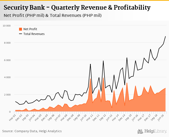 Security Bank made a net profit of PHP 2,708 mil under revenues of PHP 8,738 mil in the third quarter of 2019, up 26.5% and 37.9% respectively when compared to the same period last year.