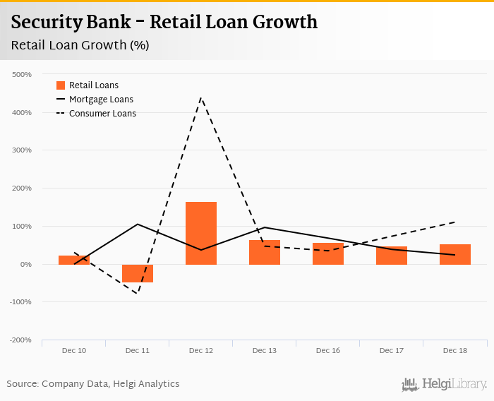 Security Bank's retail loans reached PHP 83,972 mil at the end of 2018-12-31, down 0% compared to the previous year. In the last decade, the average annual loan growth amounted to 0%.