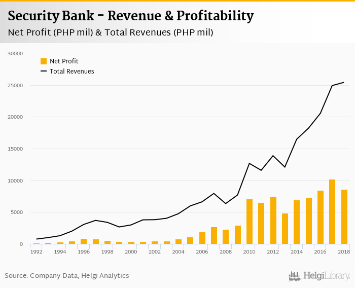 Security Bank made a net profit of PHP 8,592 mil under revenues of PHP 25,421 mil in 2018, up -16.1% and 2.03% respectively compared to the previous year.