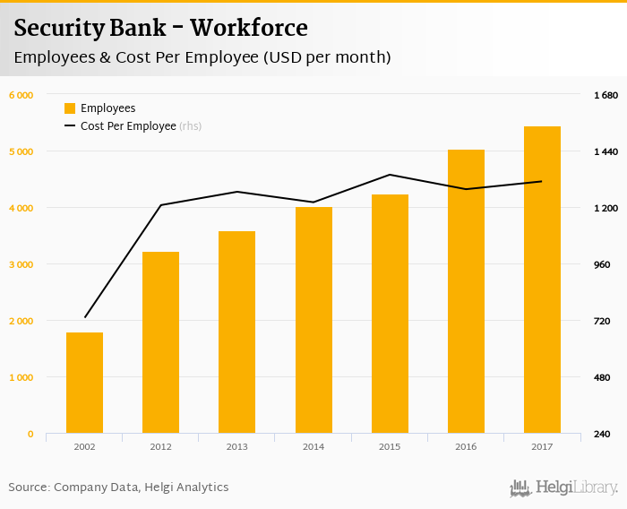 Security Bank employed 5,438 persons in 2017, up 7.98% when compared to the previous year. Historically, the bank's workforce hit an all time high of 5,438 persons in 2017 and an all time low of 1,794 in 2002.