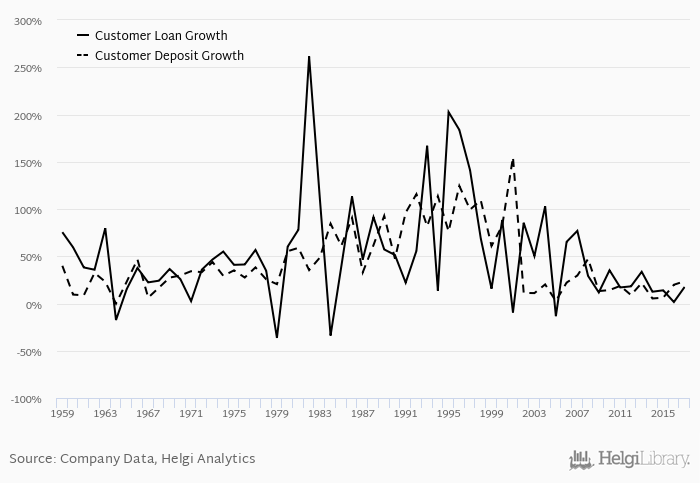 On the other hand, bank's customer deposit growth amounted to 23.6% at the end of 2017, up from 19.9% when compared to the previous year. Historically, the bank’s deposit growth reached an all time high of 155% in 2001 and an all time low of -0.151% in 1964. In the last decade, the average annual loan growth amounted to 17.3%.