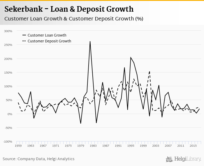 Sekerbank's customer loan growth reached 17.5% in 2017, up from 1.54% compared to the previous year. Historically, the bank’s loans growth reached an all time high of 261% in 1982 and an all time low of -36.4% in 1979. In the last decade, the average annual loan growth amounted to 18.6%.