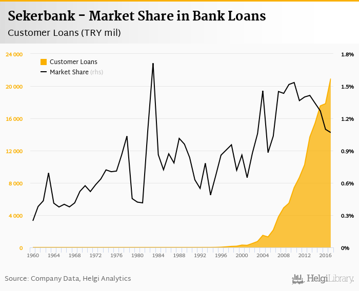 Sekerbank accounted for 1.07% of all customer loans issued in Turkey at the end of 2017. Historically, the bank’s market share in customer loans reached an all time high of 1.71% in 1983 and an all time low of 0.248% in 1960.