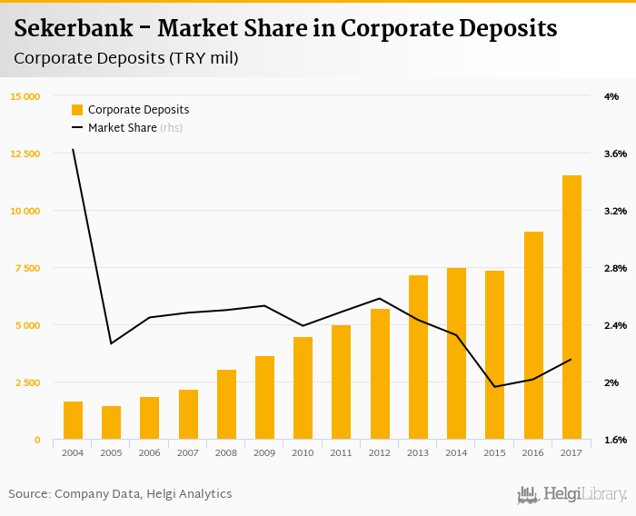 Sekerbank accounted for 2.16% of all corporate deposits taken by banks in Turkey at the end of 2017. Historically, the bank’s market share in corporate deposits reached an all time high of 3.63% in 2004 and an all time low of 1.96% in 2015.