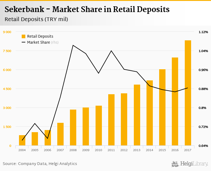 Sekerbank's retail deposits reached TRY 8,341 mil in 2017, up 19.4% compared to the previous year.