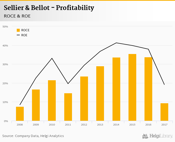 As far as Sellier & Bellot's peers are concerned, Ceska zbrojovka generated ROE of 34.5% and ROCE of 18.4% in 2017. Excalibur Army's profitability reached 16.9% and 22.0%, respectively. Omnipol operated with 22.2% and 17.7% returns in 2017.