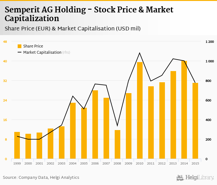 Semperit AG Holding stock traded at EUR 31.1 per share at the end 2015 implying a market capitalization of USD 774 mil.