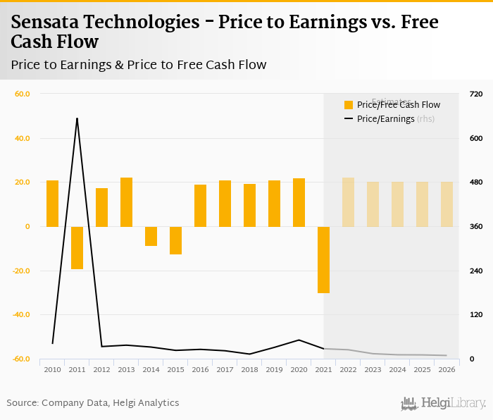Regarding cash generated defined by the sum of net profit and depreciation, the stock traded at 20.1x at the end of 2021. When investments are excluded to get free cash flow, Sensata Technologies traded at -30.0x.