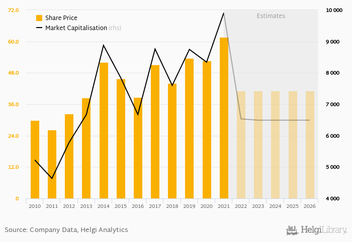 Since the end of 2016, stock has appreciated by 59.2% implying an annual average growth of 9.74% In absolute terms, the value of the company rose by USD 3,235 mil.