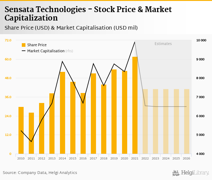 Sensata Technologies stock traded at USD 61.7 per share at the end 2021 implying a market capitalization of USD 9,909 mil.