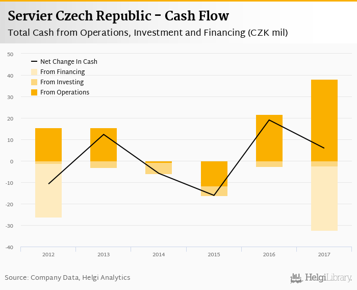 Cash from financing amounted to CZK -30.0 mil, so the company generated CZK 5.89 mil net cash in 2017.