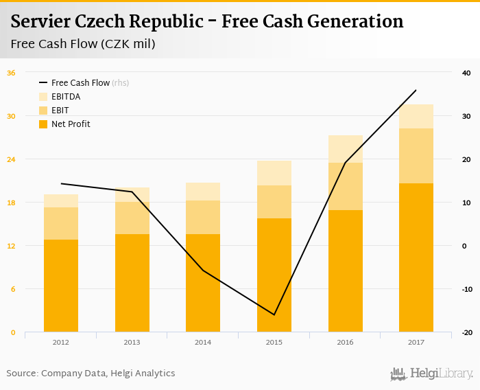 The company generated cash, defined by a sum of net profit and depreciation, of CZK 24.1 mil or 1.17% of sales. When investments are excluded, free cash flow reached CZK 35.9 mil, or 1.75% of sales in 2017.