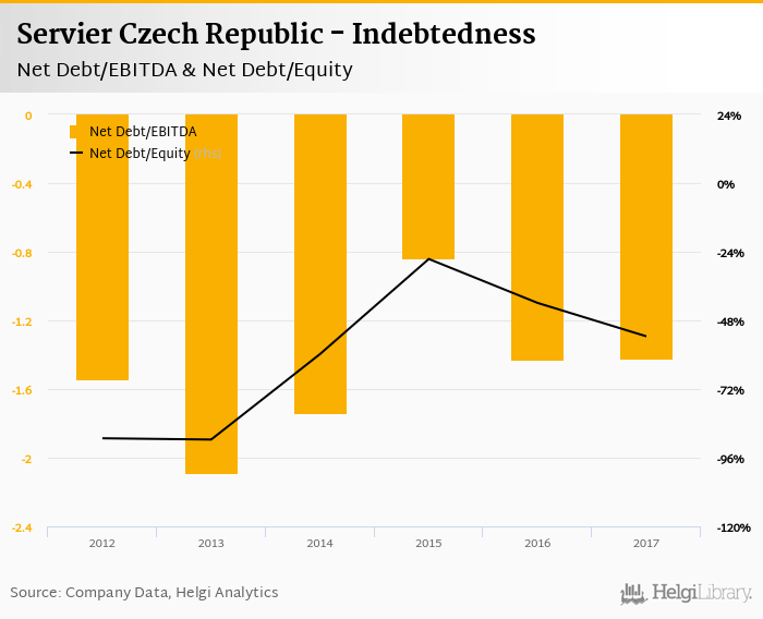 Servier Czech Republic's net debt stood at CZK -44.9 mil and accounted for -53.6% of equity at the end of 2017. The ratio is down 11.7 pp compared to the previous year.