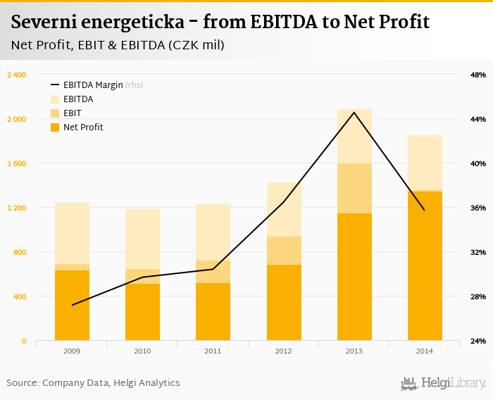 Severni energeticka made a net profit of CZK 1,346 mil with revenues of CZK 5,197 mil in 2014, up by 17.3% and up by 10.9%, respectively, compared to the previous year. This translates into a net margin of 25.9%.