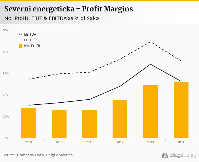 Severni energeticka made a net profit of CZK 1,346 mil with revenues of CZK 5,197 mil in 2014, up by 17.3% and up by 10.9%, respectively, compared to the previous year.