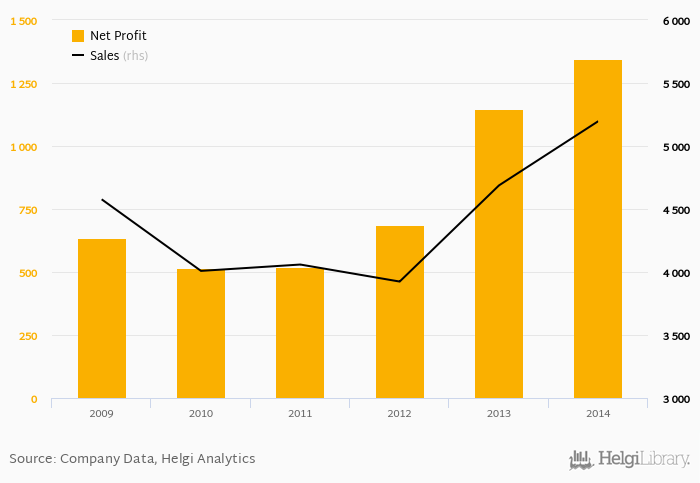 Sales have grown by 2.57% a year on average since 2009. They reached a high of CZK 5,197 mil in 2014 and a low of CZK 3,924 mil in 2012.