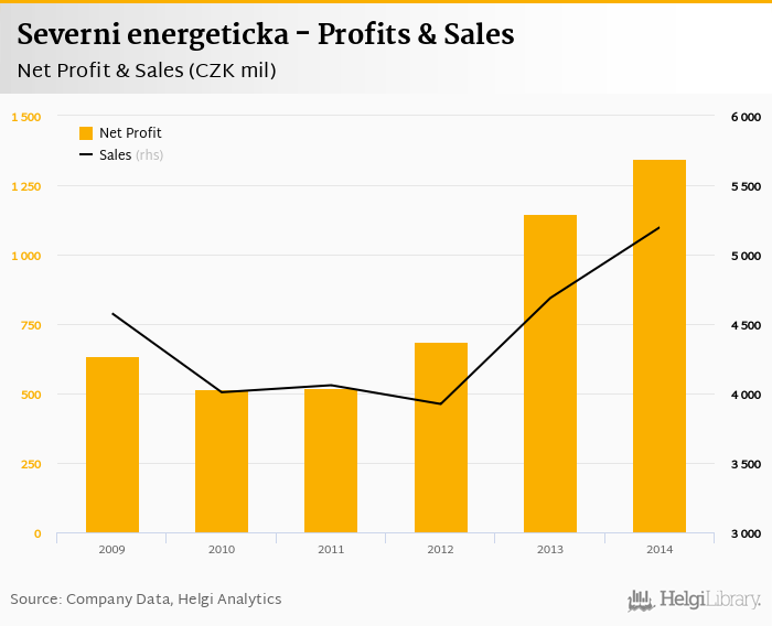 Severni energeticka made a net profit of CZK 1,346 mil in 2014, up 17.3% compared to the previous year. Total sales reached CZK 5,197 mil, which is up 10.9% when compared to the previous year.