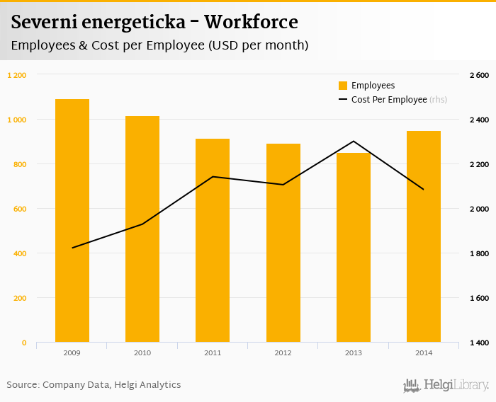 Severni energeticka employed 949 employees in 2014, up 11.5% compared to the previous year. Historically, between 2009 and 2014, the firm's workforce hit a high of 1,092 employees in 2009 and a low of 851 employees in 2013.