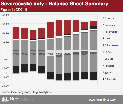 Severoceske doly's assets exceeded CZK 33 bil at the end of 2012. More than half of that (65% of total, to be precise) came from fixed assets, which was is fully financed by the Company's equity.