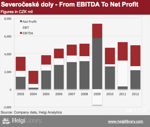 The Company reached a net profit of nearly 3 bil in 2012. This is 28% less than the average seen in the last five years. On the EBITDA level, Severoceske Doly's profit amounted to nearly CZK 5 bil, some 4% less than the average in 2007-2011.