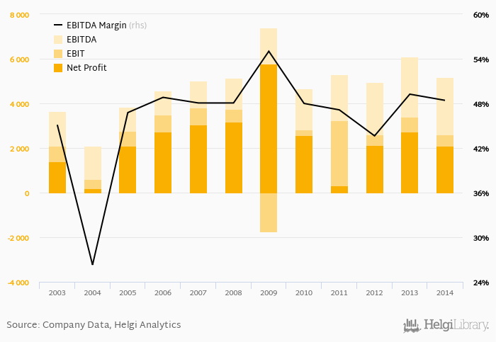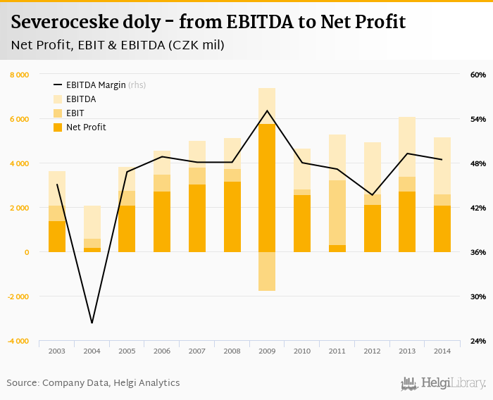 Severoceske doly made a net profit of CZK 2,080 mil with revenues of CZK 10,672 mil in 2014, down by 24.2% and down by 13.6%, respectively, compared to the previous year. This translates into a net margin of 19.5%.