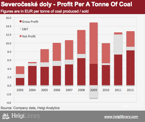 Severočeské Doly extracted more than 23 mil tonnes of brown coal in 2012. Nearly 70% of total has been sold to state-owned ČEZ. Based on the income statement figures, we guesstimate that Severočeské Doly made on average EUR 3.65 per tonne extracted in 2012. This is 27% less than the average in 2007-2011.