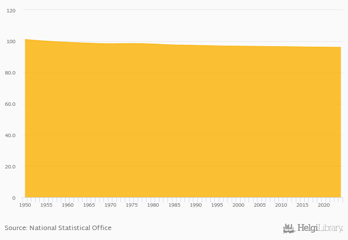Historically, sex ratio measured by males per 100 females in Turkey reached an all time high of 101 persons in 1950 and an all time low of 96.1 persons in 2024. When compared to Turkey's main peers, sex ratio measured by males per 100 females in Bulgaria amounted to 93.3 persons, 97.7 persons in Greece, 102 persons in Iraq and 101 persons in Iran in 2024.