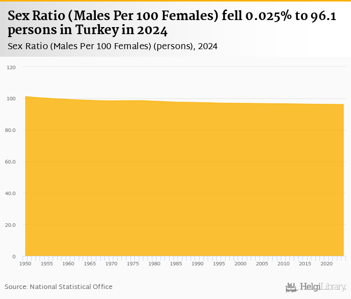 Sex ratio measured by males per 100 females fell 0.025% to 96.1 persons in Turkey in 2024, according to the National Statistical Office.